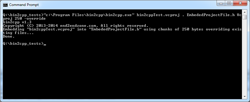 bin2cpp.exe bin2cppTest.vcproj outdir EmbededProjectFile.h Vcproj 250 -override