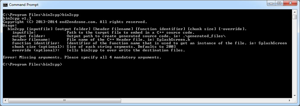 Usage: bin2cpp [inputfile] [output folder] [header filename] [function identifier] [chunk size] [-override].