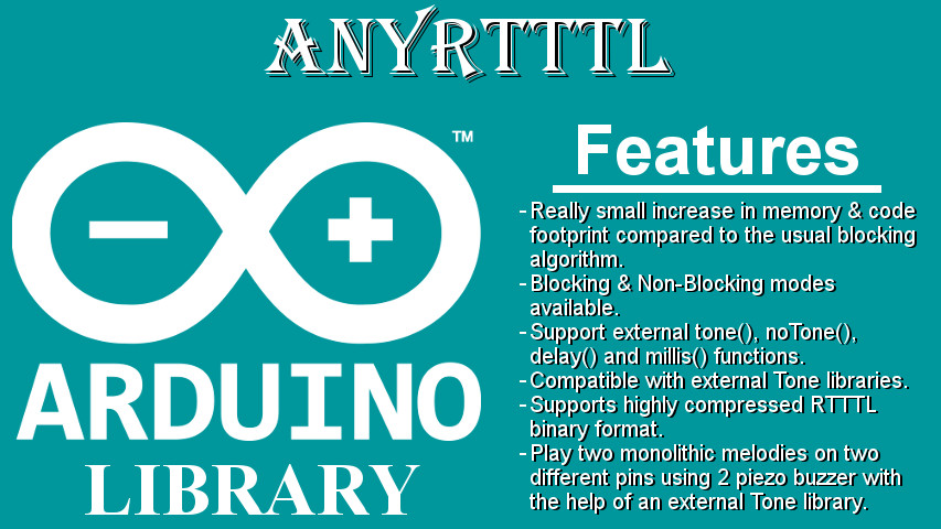 The following article is about yet another Arduino library that I have written. AnyRtttl is a feature rich arduino library for playing RTTTL melodies. The library offers much more interesting features than relying on the widely available void play_rtttl(char *p) function. The AnyRtttl is a feature rich library which supports all best RTTTL features.