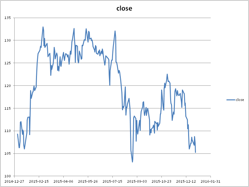 The following example show the Apple Share Prices closing value over the year 2015. The data is provided by Nasdaq at the following address: http://www.nasdaq.com/symbol/aapl/historical.