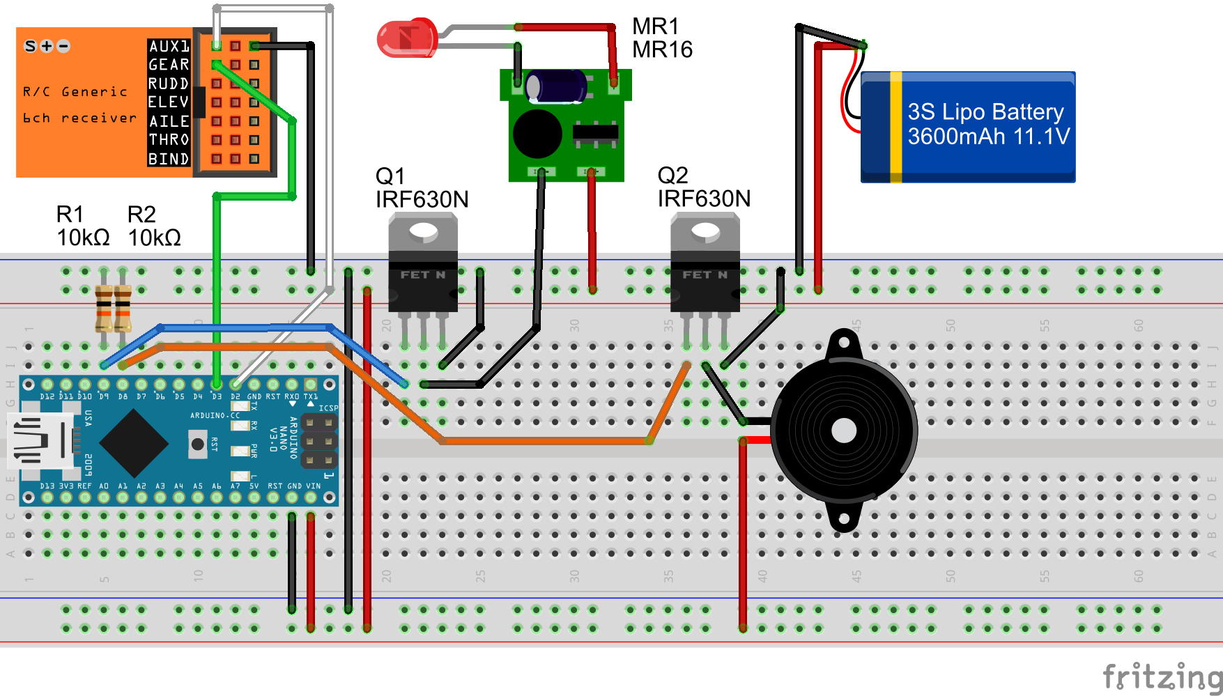 Build the circuit as showed by the picture above. For reference, the yellow and blue wires matches the blue and orange wire of the breadboard layout. These wires are connected to pins which drives low LEDs instead of high current mosfets. The prototype uses a simple CCPM Servo Tester for emulating the 6-ch receiver. In this configuration, the red LED matches the 10W front LED and the green LED matches the buzzing state.
