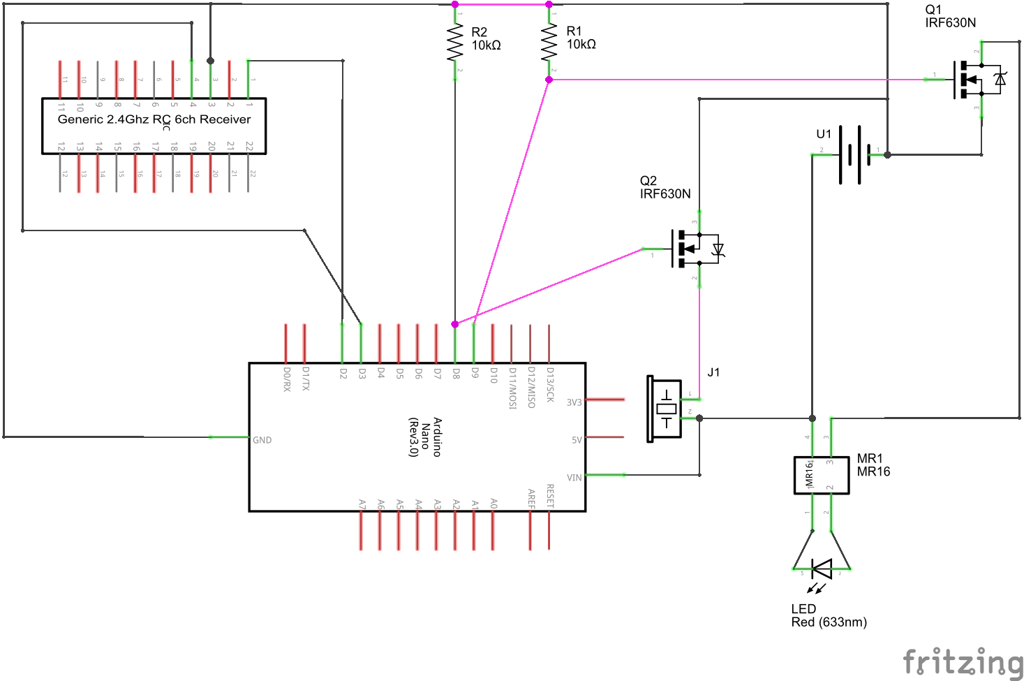 All drawings and diagrams are build using Fritzing version 0.9.2b which is an open-source hardware initiative tool that allows developers to document their prototypes and share them with others. The application already features a huge parts library but there is no support for a Generic Remote Controlled (RC) 6-Channels Receiver and for the MR16 Constant Current LED Driver.