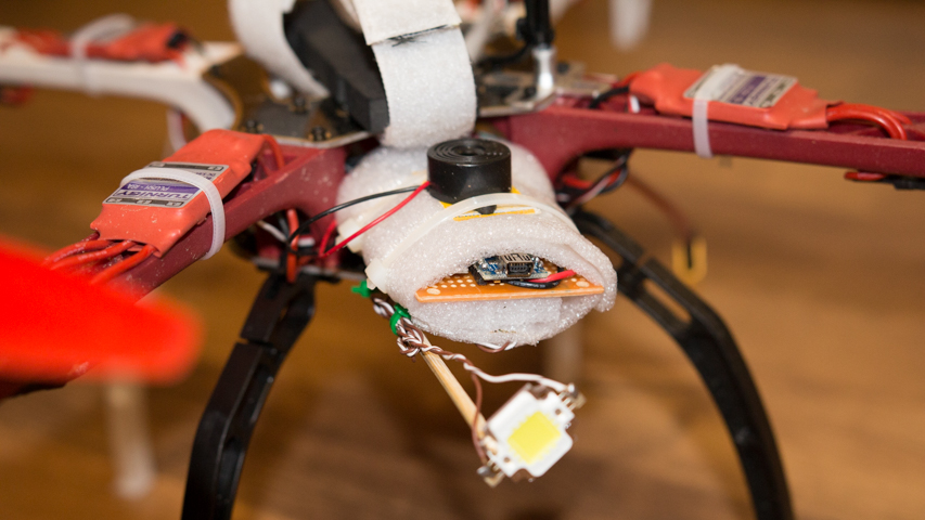 The first device is a 10 watts light-emitting diode (LED) mounted to the front of the quadcopter. This option adds to existing visual aids and help the pilot to develop his situation awareness. The front LED allows the pilot to know when the quadcopter is facing him and help the pilot recover in case of lost orientation.