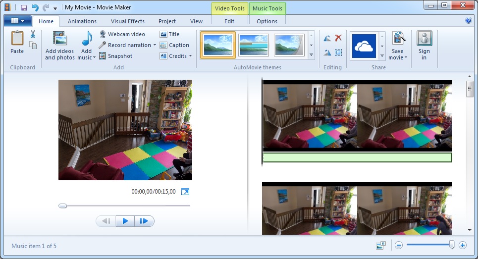 Windows Movie Maker supports adding an audio track to the video. You can use an audio file or the audio of another video as an audio track. To add an audio track, follow theses steps: